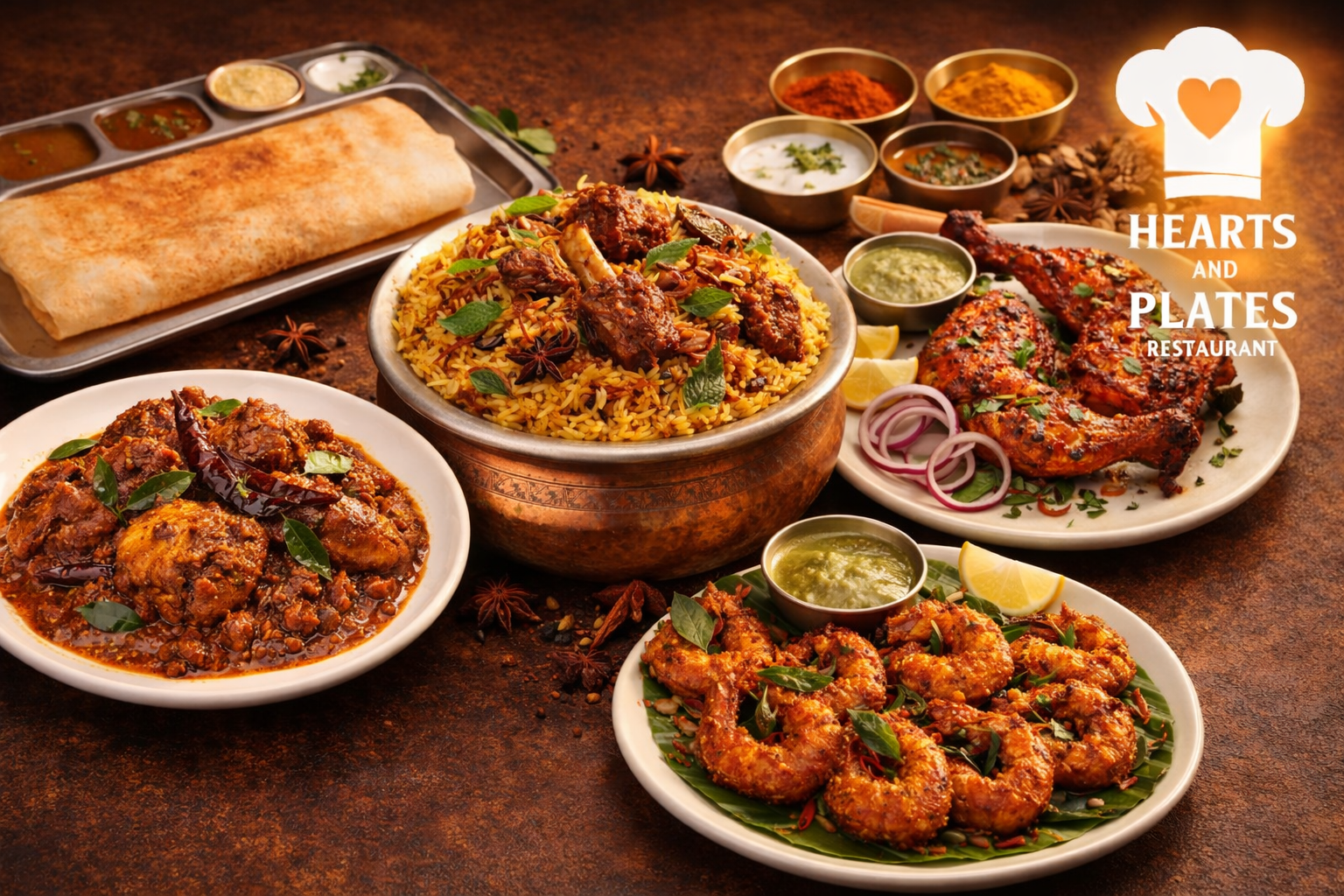 Experience authentic flavors from Chettinad, South Indian, Tandoori, Biryani, Indo-Chinese, Seafood, and Desserts.